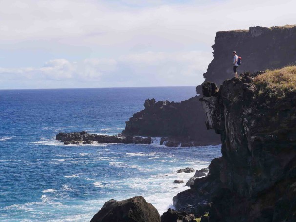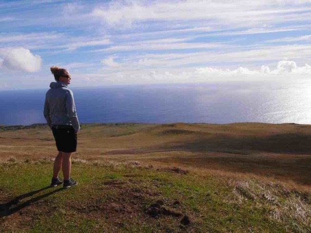 Until this day we were unbelievably lucky with the weather and for the first time on this trip, we get a bit of rain. Luckily it’s only in the afternoon so we spend the time before lunch to discover the south part of the Island where we enjoy the waves at the sightseeing spot Ana Kai Tangata and walk up to the Rano Kau crater to get a fabulous view before the rain comes in. We decide to discover this sight further the next day as this is one out of two sights on the island that can only be visited once with the national park ticket. We escape the rain as we hitchhike down the hill, buy postcards and look for souvenirs in the stores that are open and spend the rest of the day at our hotel.